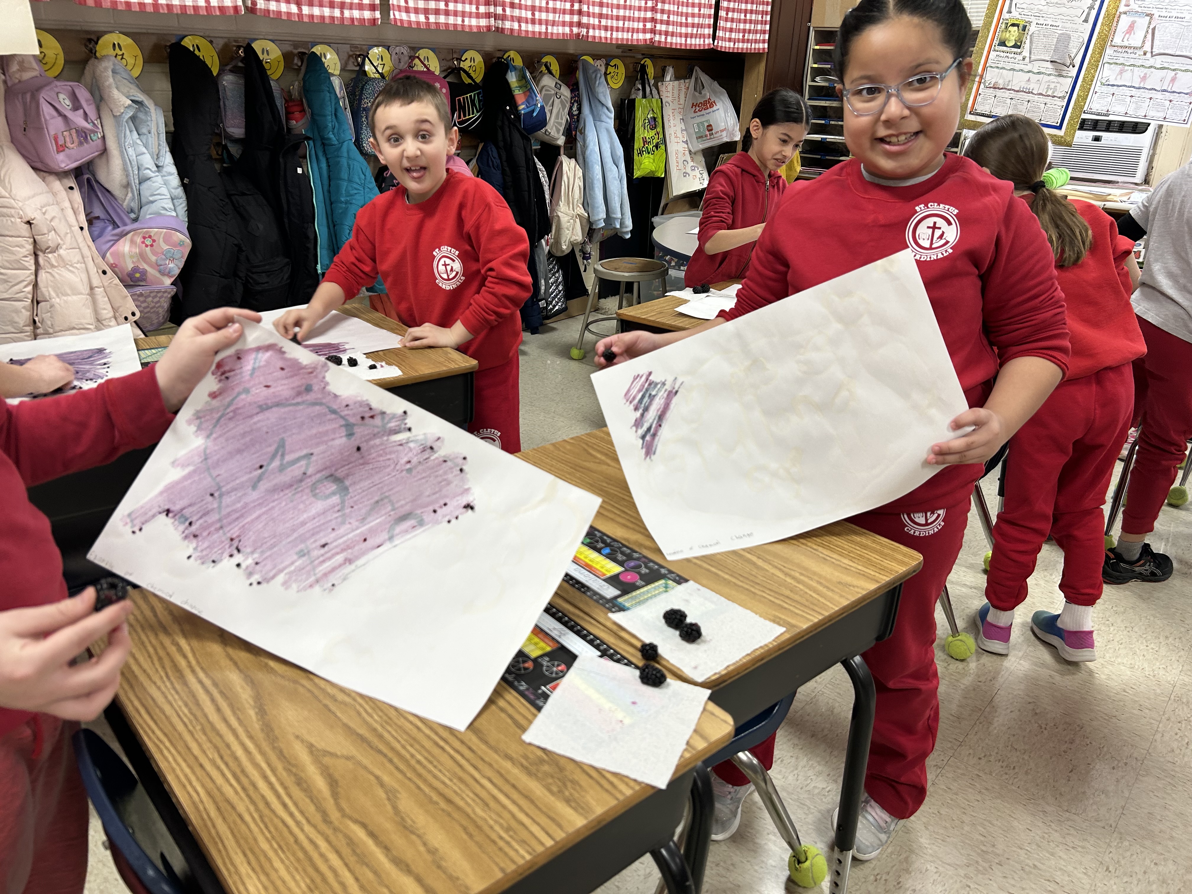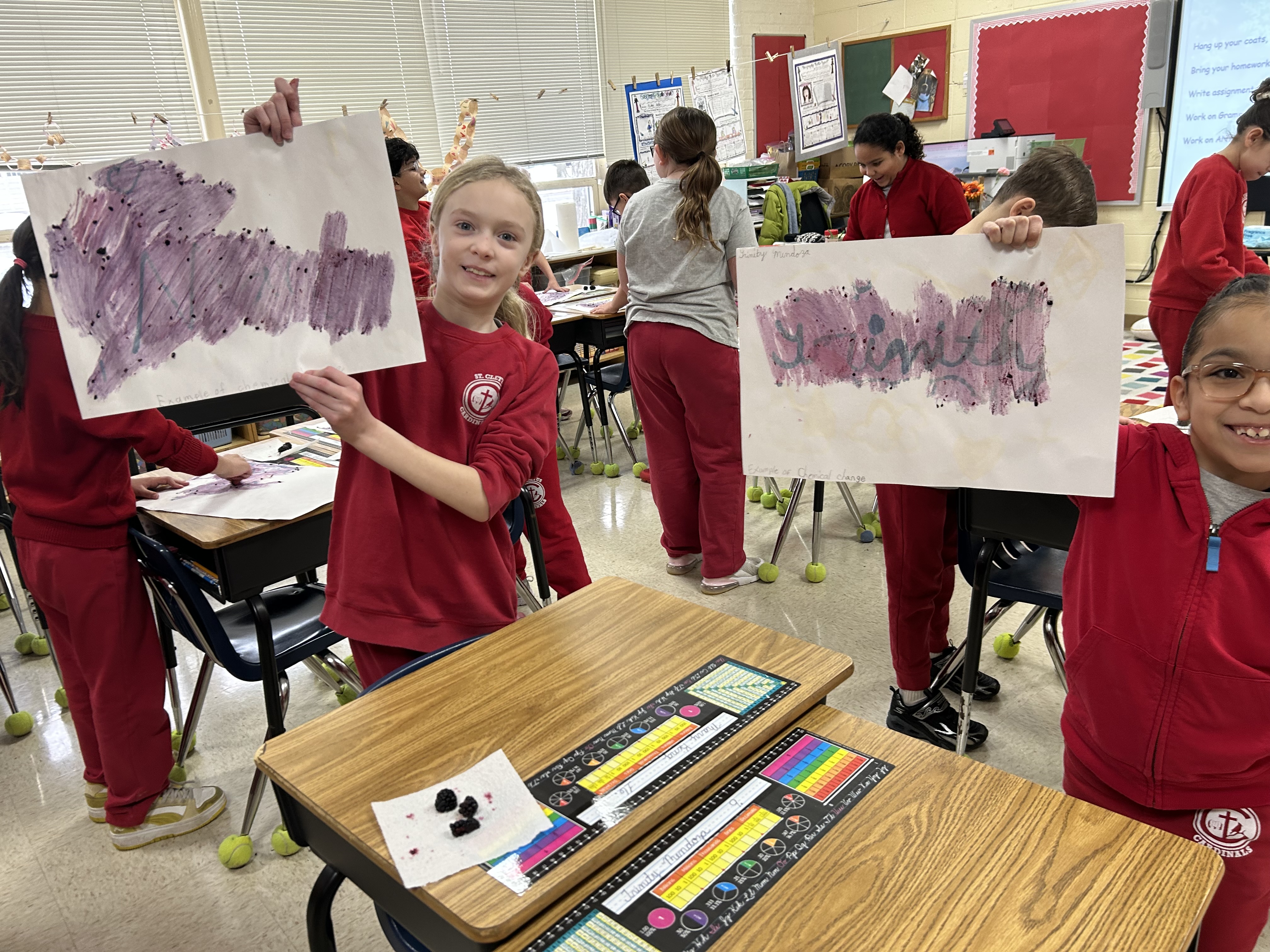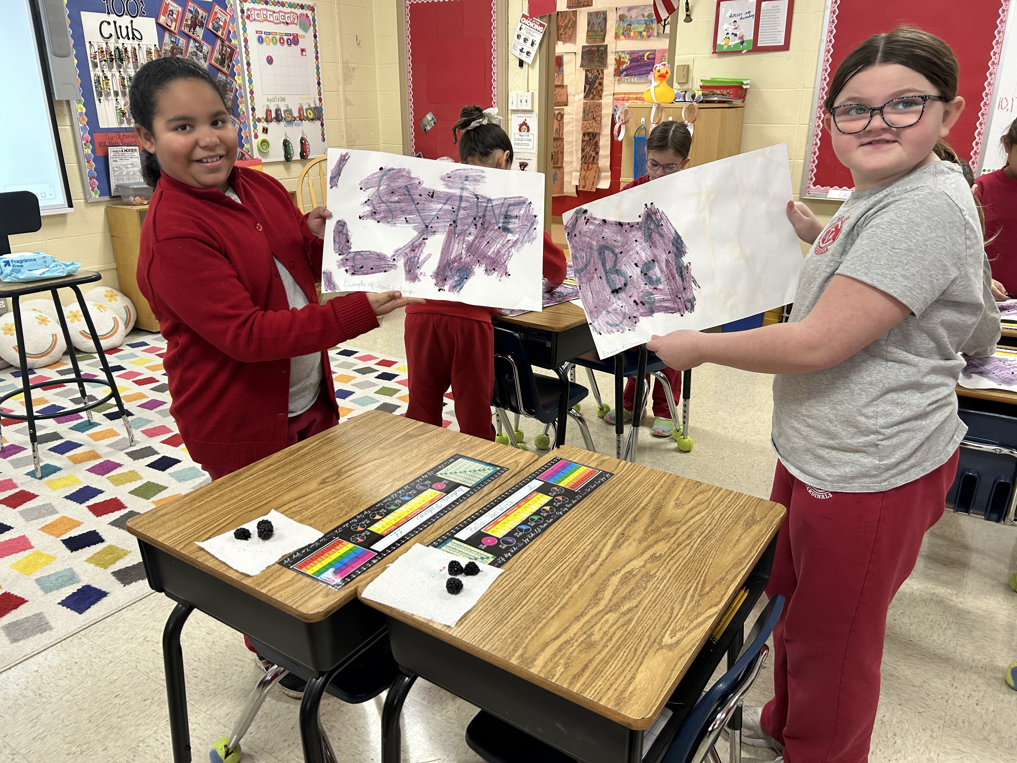 Our CHEMICAL CHANGE Experiment:  We used water, baking soda and black berries to create our designs