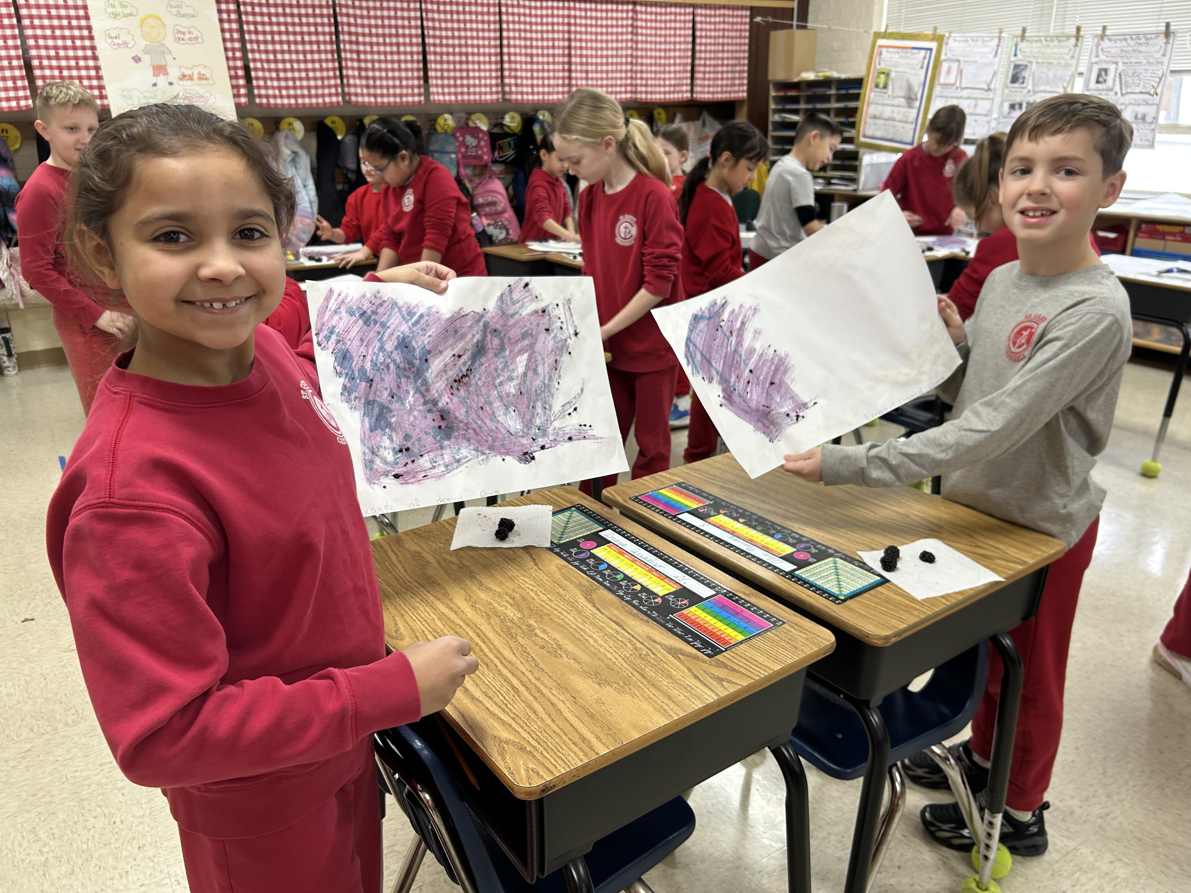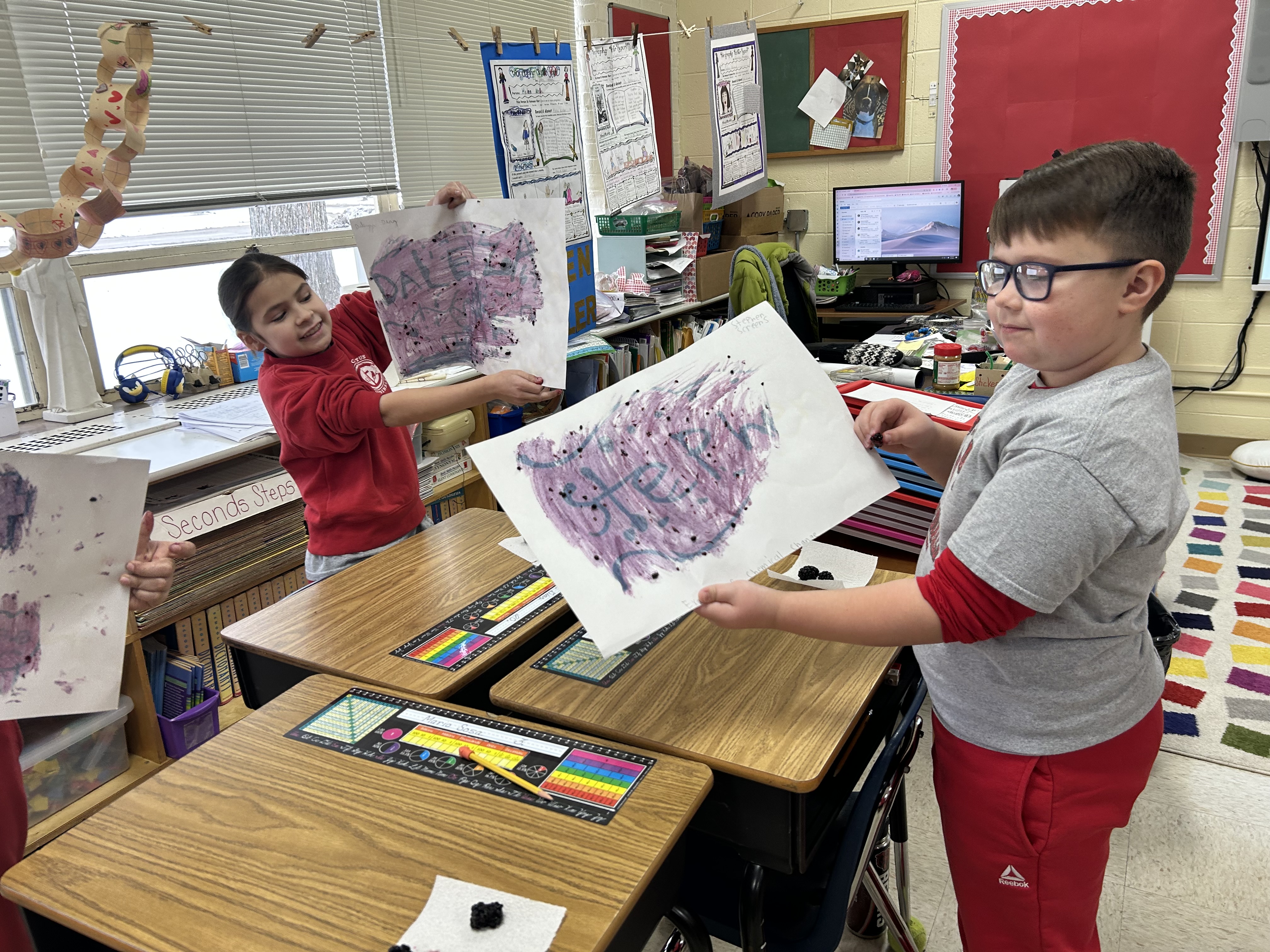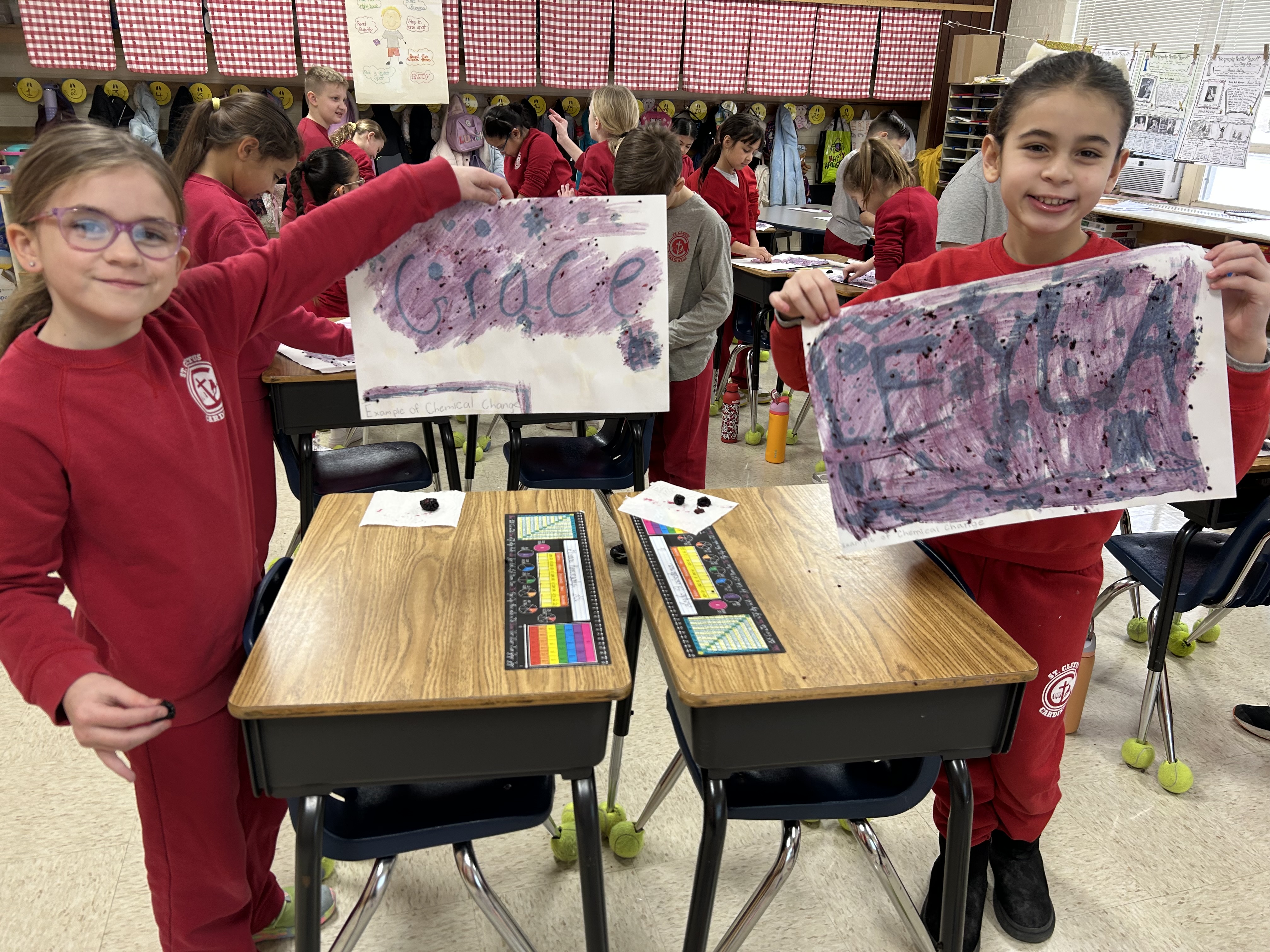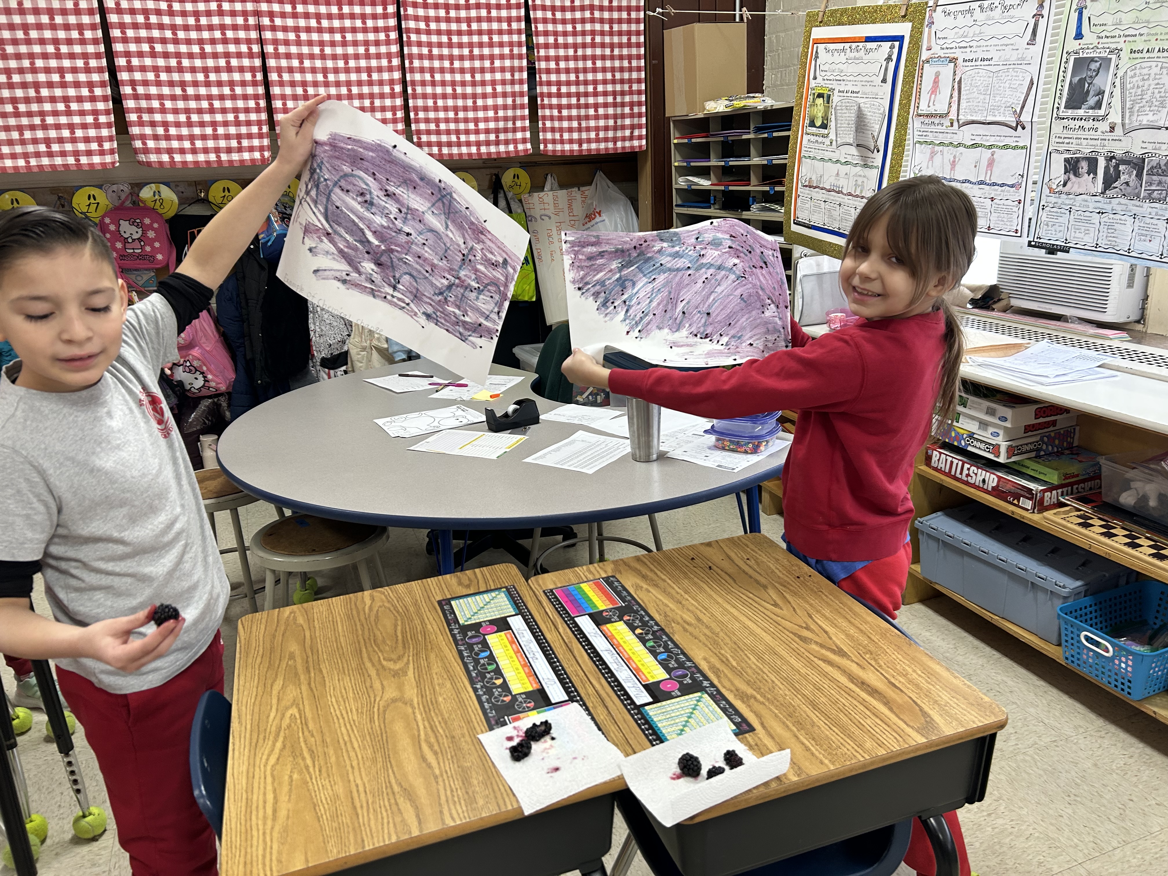 Our CHEMICAL CHANGE Experiment:  We used water, baking soda and black berries to create our designs