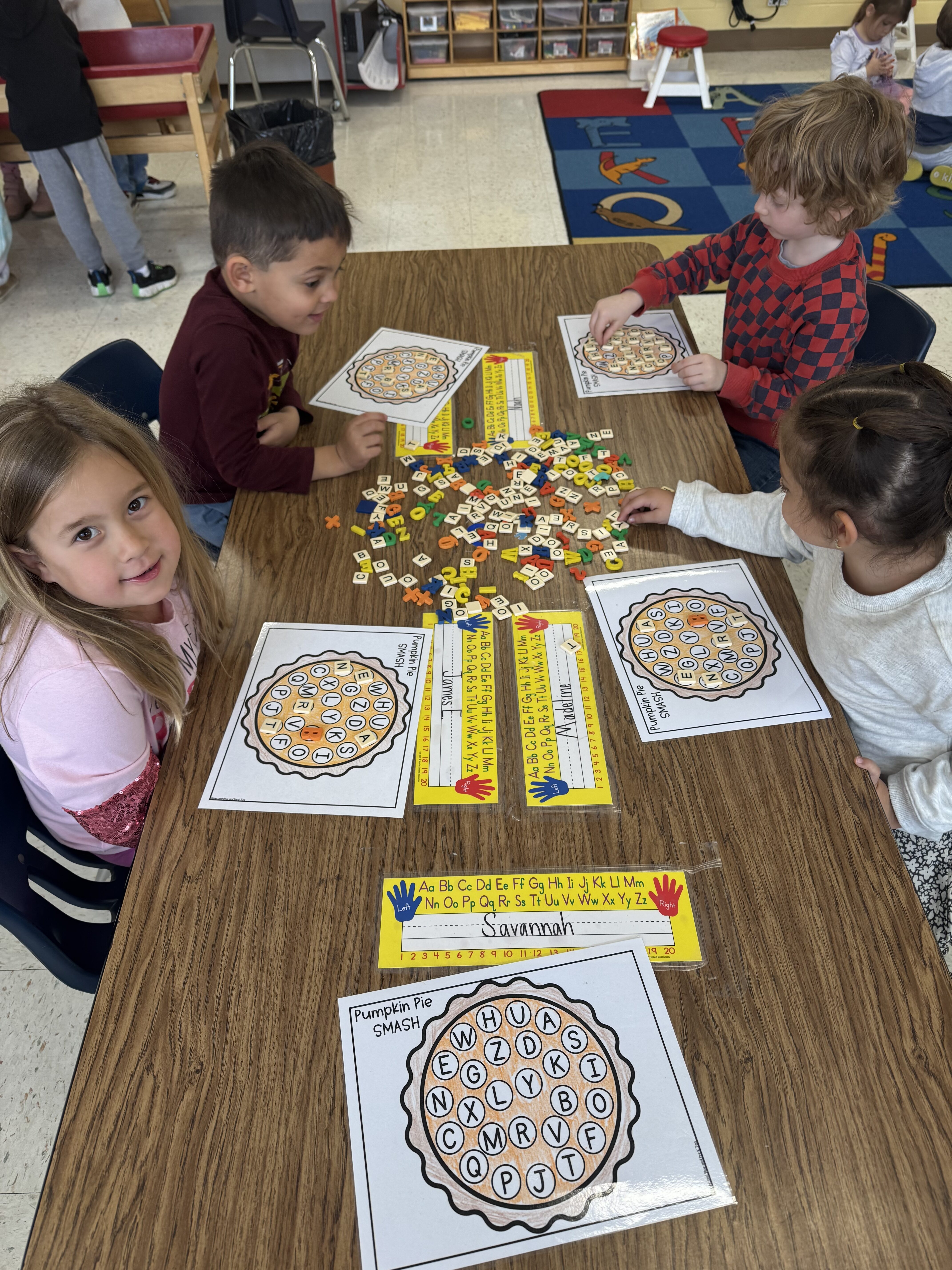 Religion:  The Grateful Pumpkin Continues, and your kids have been taking turns filling in the blanks for what they are Grateful for.  This week we also did a watercolor project where the kids had to paint over a friends name and sign the back of it.  We gathered in a circle and one by one they showed off their artwork and said ” Thank you” to their friend for the art.  It was simple , but a way to show friendship and gratitude for special things friends do for you.