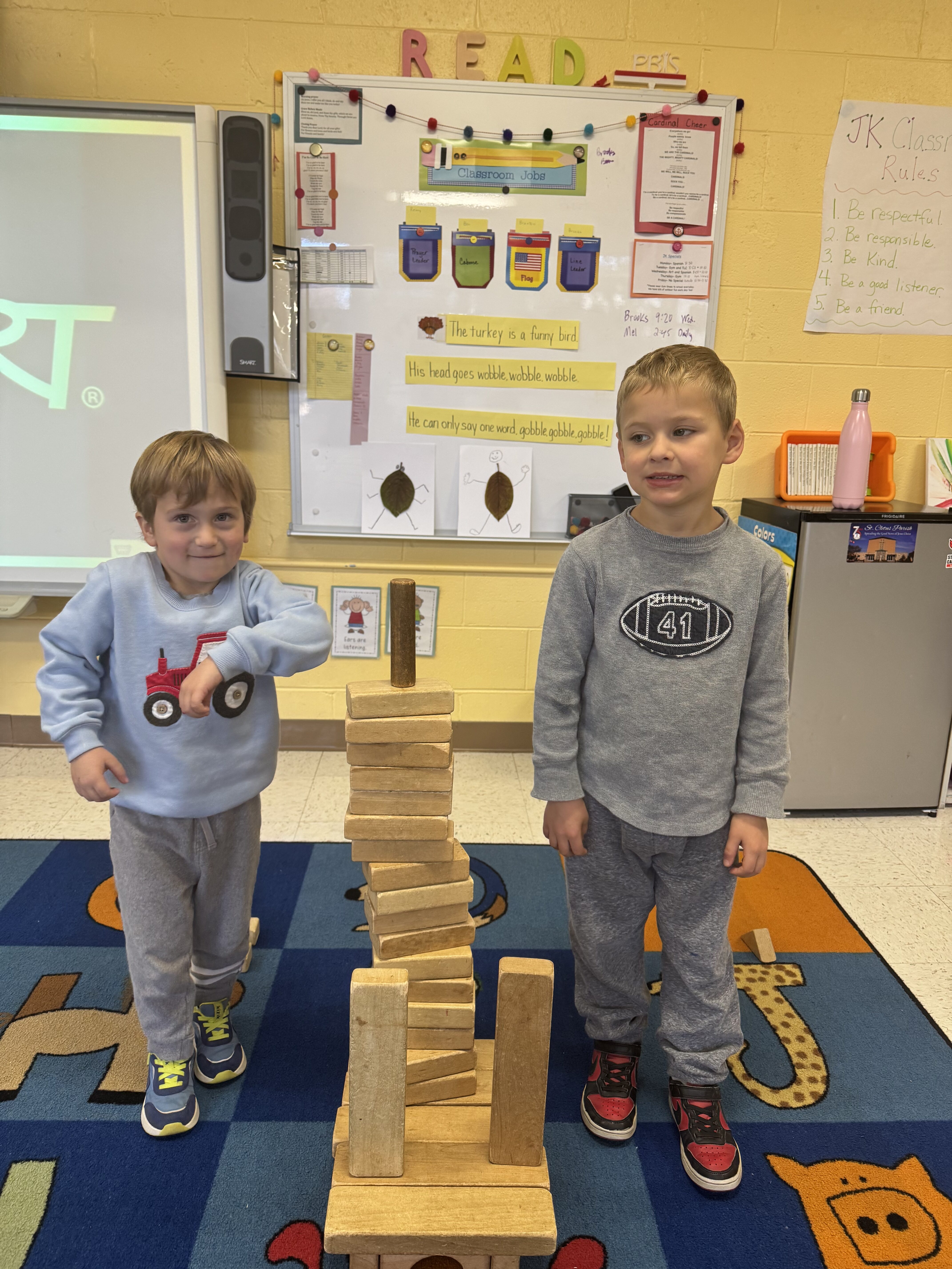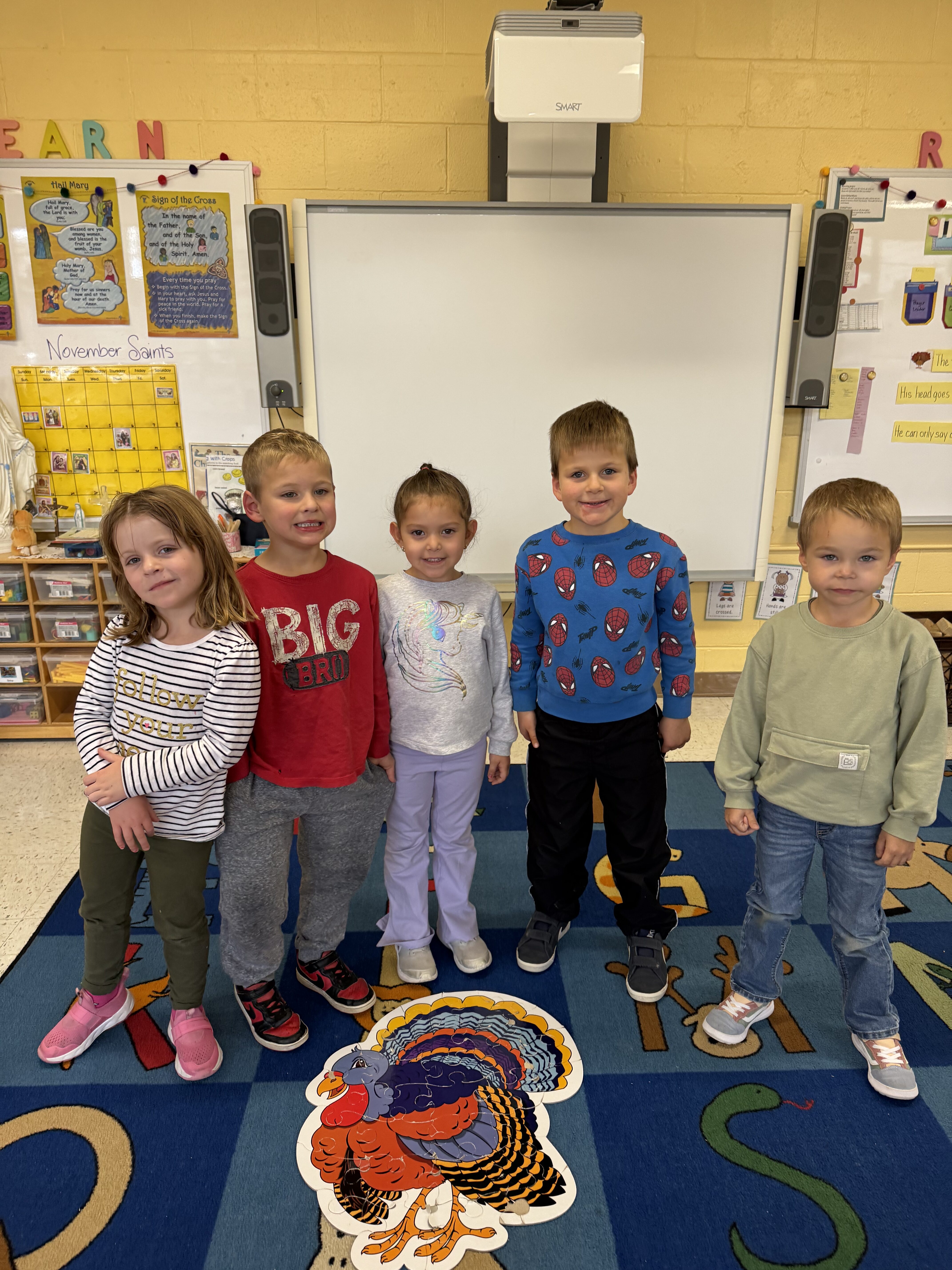 We had a full week of fun in JK! We have been blessed with some more beautiful weather.  As the cooler weather comes in, please make sure to have coats, hats and gloves for your kids. We will be outside for fresh air everyday.  If its too wet in the grass, we will go for a walk.  Fresh air and movement is so important to the healthy development of the young child, and it’s a lot of fun! The kids run around and play games, and enjoy time on the playground too! We also have the gym for the days when the weather does not cooperate.