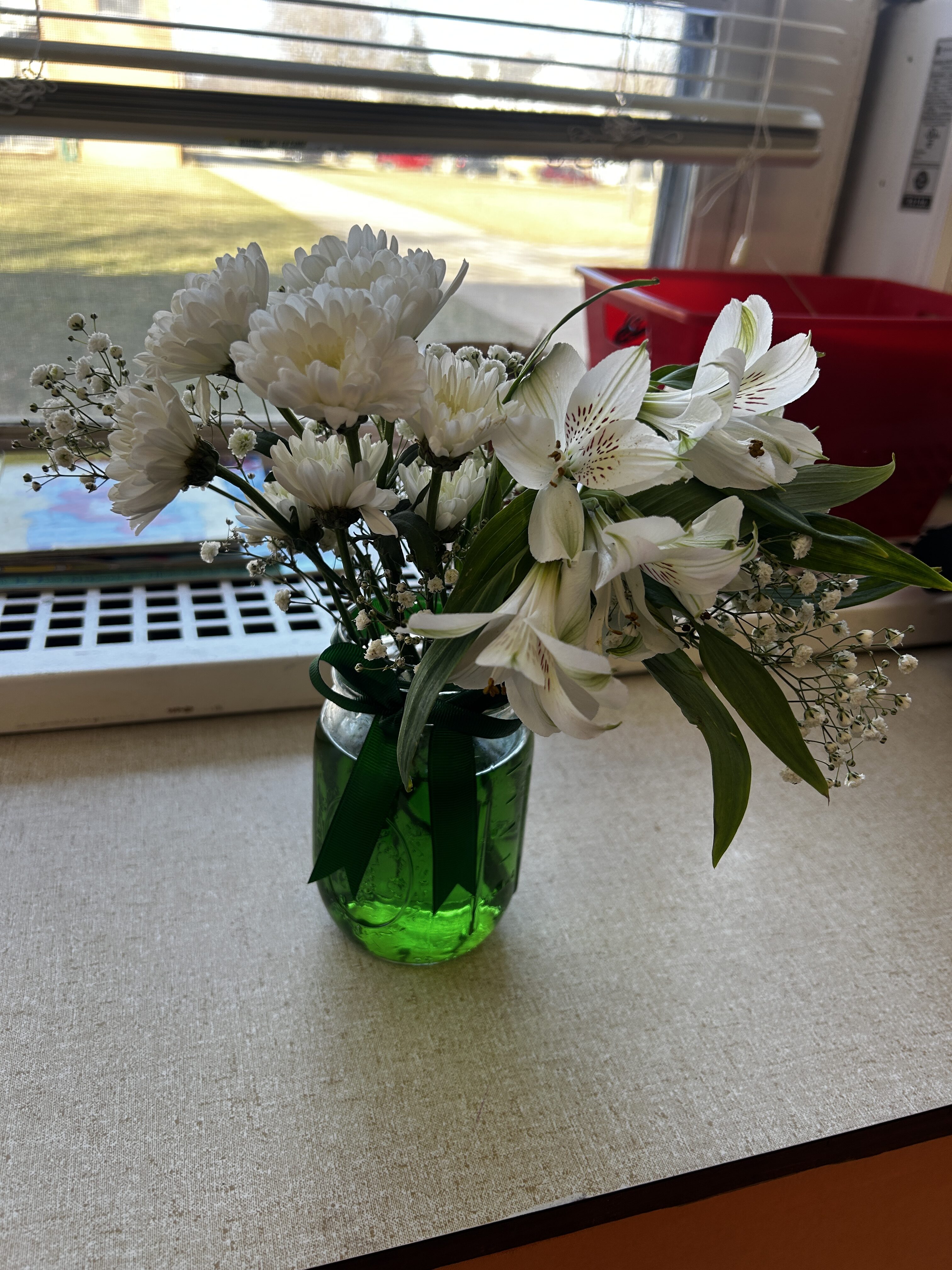 *We started a new science experiment. We mixed yellow and blue food coloring to make the water green. Then we added white flowers to the water. We will see if they change color!