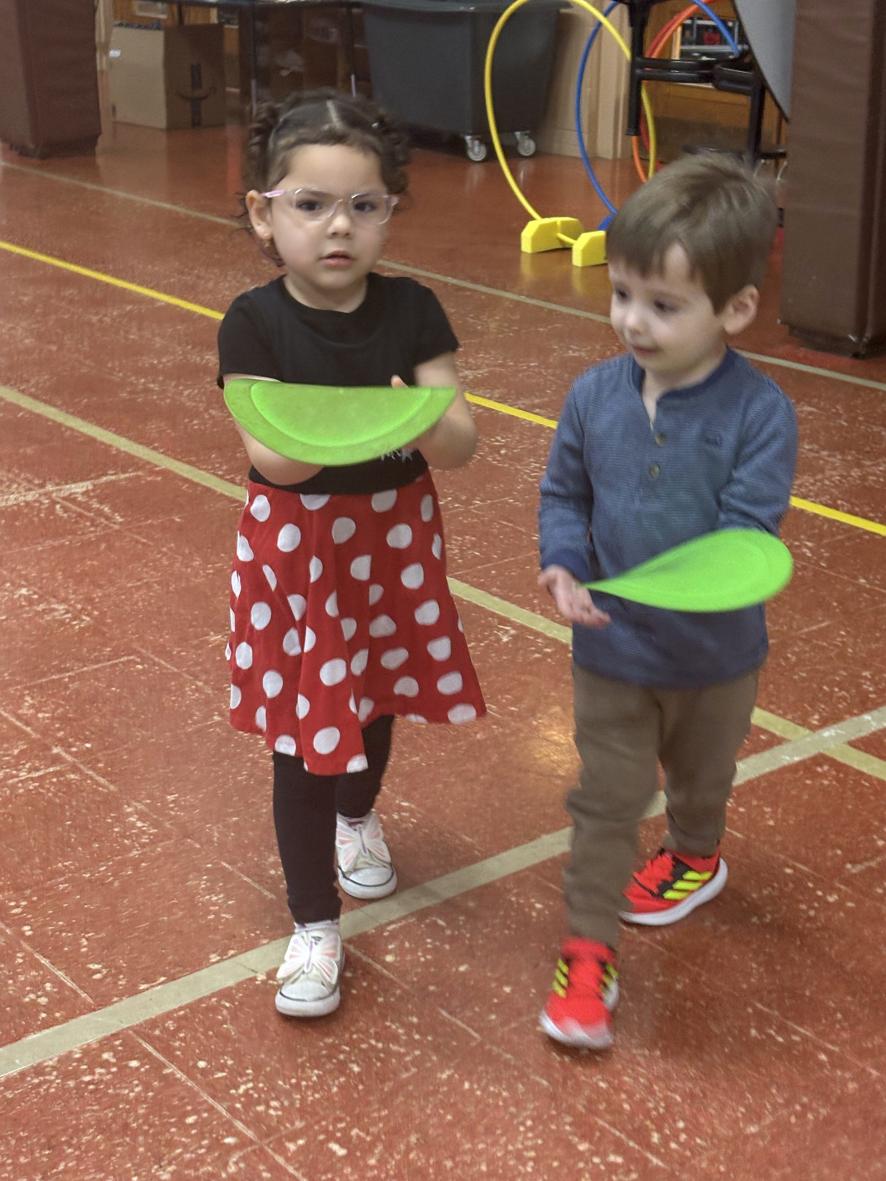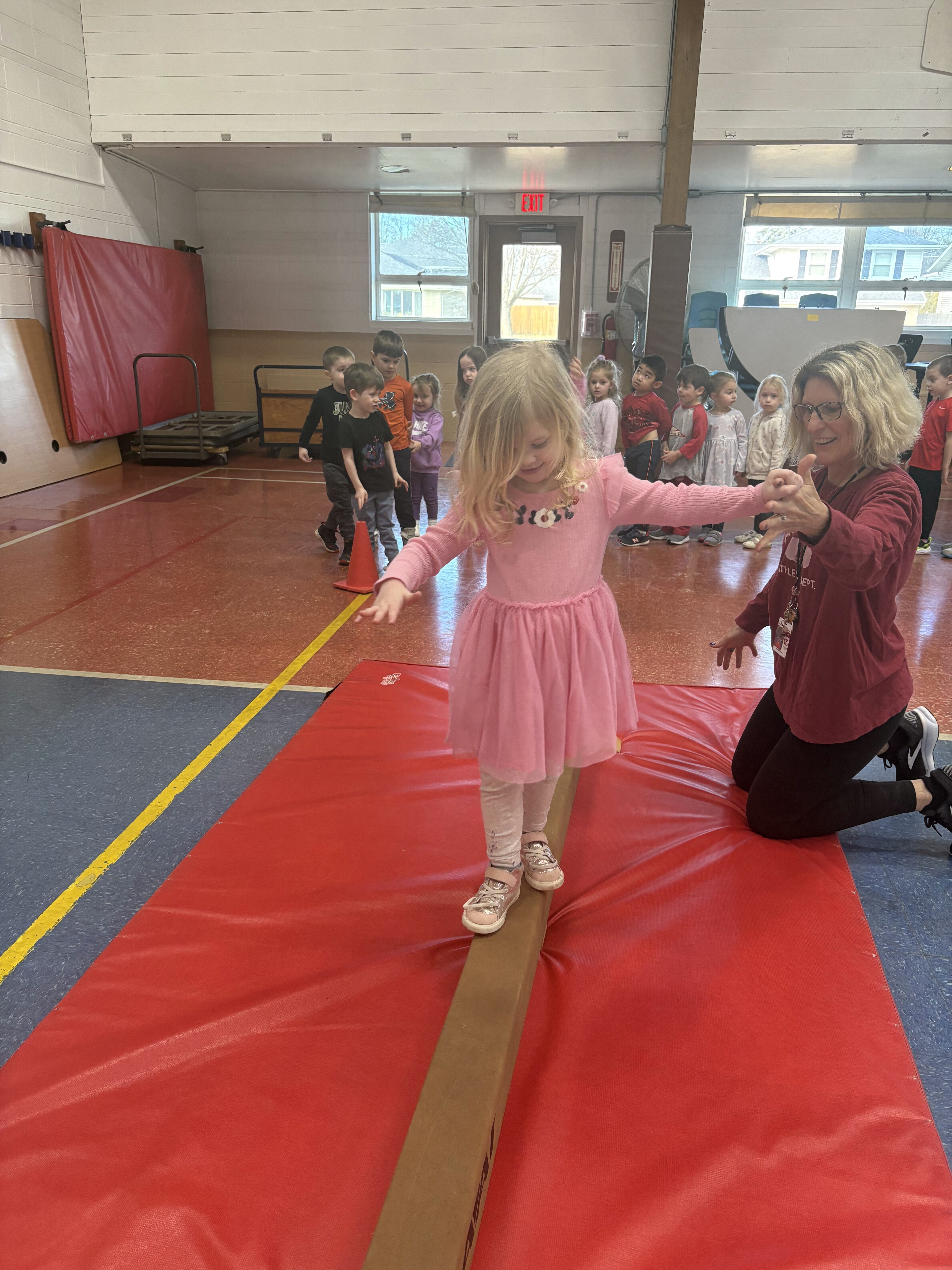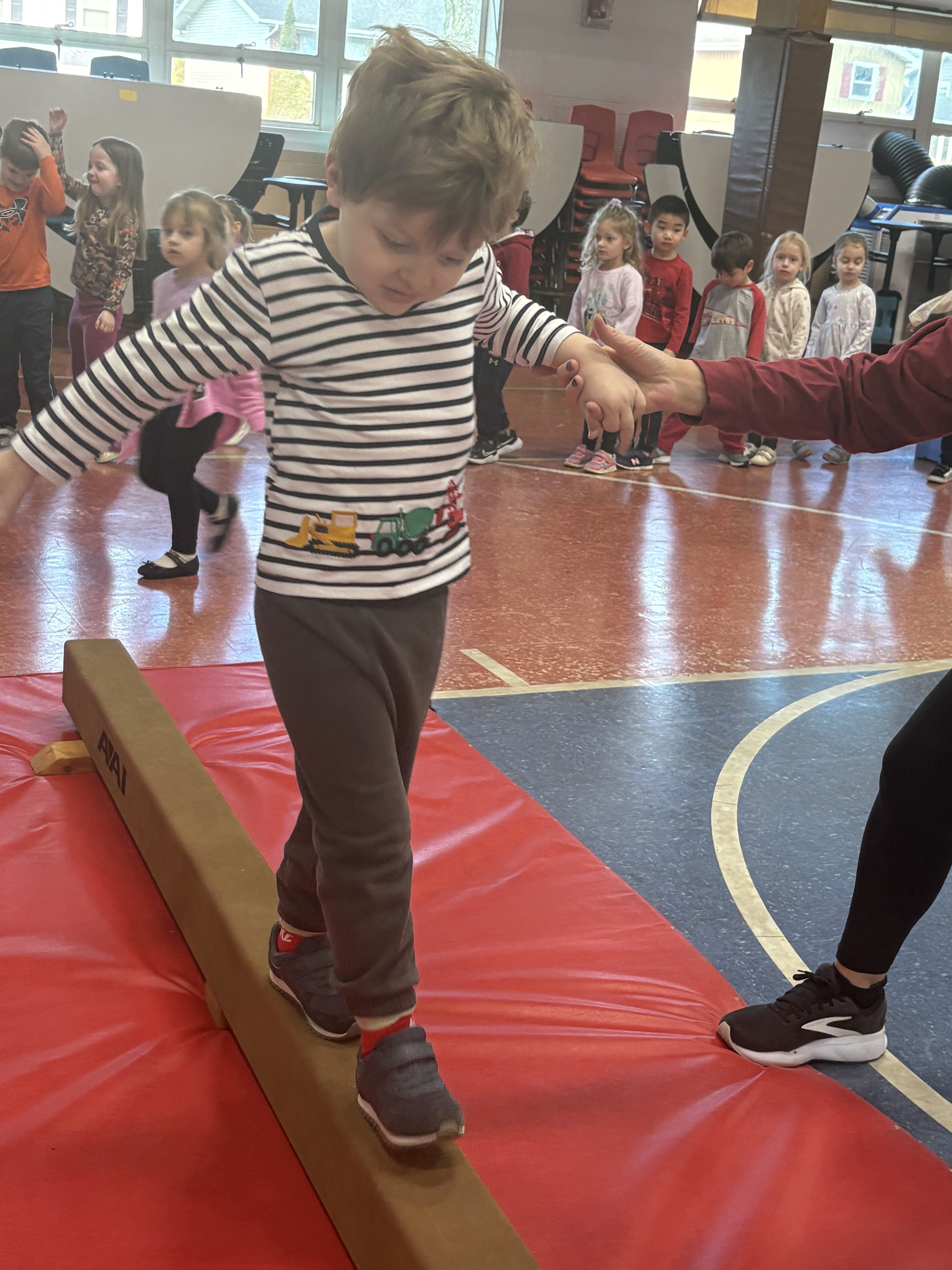 *We completed an obstacle course in P.E.! We learned how to walk on a balance beam with our arms out like an airplane!